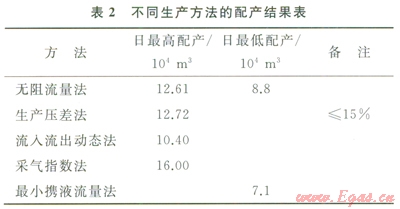 氣井的最小攜液產(chǎn)量也是配產(chǎn)的重要考慮參數(shù)。該參數(shù)用以保證氣井生產(chǎn)時(shí)井筒不產(chǎn)生積液。臺(tái)H2-1井分別采用73mm、60.3mm、48.3mm這3種規(guī)格的油管進(jìn)行模擬計(jì)算,得出其最小臨界攜液日產(chǎn)量分別為7.1×104m3、4.9×104m3和3.2×104m3。目前該井使用的為73mm油管,確定其最小臨界攜液流量為7.1×104m3/d。通過(guò)以上幾種方法配產(chǎn)方法,其匯總結(jié)果如表2所示。