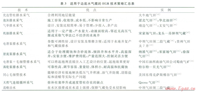 我國(guó)邊底水氣藏大多數(shù)已進(jìn)入開(kāi)發(fā)中后期階段,面臨水侵現(xiàn)象嚴(yán)重,而采取人工排水采氣技術(shù)更應(yīng)注意各種排水工藝的技術(shù)特點(diǎn)以及適應(yīng)條件,以便取得最好的排水效果。通過(guò)多年的研究和發(fā)展,目前國(guó)內(nèi)外都已形成了各自的提高邊底水氣藏采收率的技術(shù)。其針對(duì)邊底水氣藏的EGR技術(shù)策略總結(jié)如表3所示。