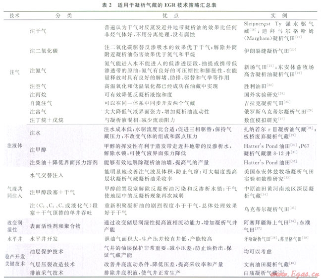 6)表2中雖然列出了現(xiàn)發(fā)表的EGR技術(shù),有些還處于評(píng)價(jià)研究階段,還未投入現(xiàn)場(chǎng)應(yīng)用,應(yīng)用時(shí)要針對(duì)具體的氣藏情況,考慮現(xiàn)有技術(shù)和經(jīng)濟(jì)條件來(lái)確定是否值得實(shí)施。