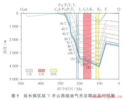 山西組砂巖中流體包裹體的測(cè)溫結(jié)果表明:①延長地區(qū)上古生界山西組至少存在3期流體活動(dòng),第Ⅰ期流體活動(dòng)的主峰溫度在85~90℃,規(guī)模較??;第Ⅱ期流體活動(dòng)的主峰溫度在115~120℃,這期流體形成了大量石英加大邊;第Ⅲ期流體活動(dòng)的主峰溫度在135~155℃,流體規(guī)模較大。②高于l65℃的樣品點(diǎn)34個(gè),溫度范圍較分散。③從測(cè)點(diǎn)數(shù)日來看,110~165℃區(qū)間內(nèi)的數(shù)據(jù)點(diǎn)較多,共計(jì)482個(gè)。在3期流體活動(dòng)中均檢測(cè)到含烴包裹體,因此推測(cè)其與油氣充注有關(guān)。將流體包裹體的均一溫度投影在單井埋藏史圖上(圖5),發(fā)現(xiàn)3期油氣充注分別發(fā)生在晚三疊世、中晚侏羅世和早白堊世。