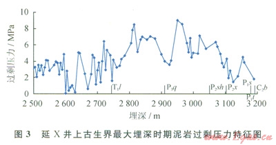 一般來說浮力和水動(dòng)力是油氣二次運(yùn)移的主要?jiǎng)恿?,在常?guī)油氣二次運(yùn)移過程中浮力和水動(dòng)力作用較強(qiáng)。但在鄂爾多斯盆地上古生界由于儲(chǔ)層成巖早期壓實(shí)作用和膠結(jié)作用強(qiáng)烈,因而在造成儲(chǔ)層致密化的同時(shí),也導(dǎo)致儲(chǔ)層中的自由水大為減少,從而難以產(chǎn)生較強(qiáng)的浮力和水動(dòng)力[28]。另一方面,流體南高勢(shì)區(qū)向低勢(shì)區(qū)運(yùn)移的原理只適用于連通的水力系統(tǒng),而不適用于多個(gè)封隔體之間。泥巖壓實(shí)研究表明,盆地上古生界地層在三疊紀(jì)末 白堊紀(jì)發(fā)育“非均衡壓實(shí)” [16-17,21,24,26],該區(qū)最大埋深時(shí)期(白堊紀(jì))泥巖過剩壓力幅度介于0~10MPa,過剩壓力峰值出現(xiàn)在三疊系劉家溝組—上石盒子組(圖3),在壓力封存箱的上下、側(cè)向高壓泥巖阻隔之間,很難出現(xiàn)區(qū)域運(yùn)移??梢姡鯛柖嗨古璧厣瞎派缛狈μ烊粴獯笠?guī)模、長距離運(yùn)移的動(dòng)力條件。