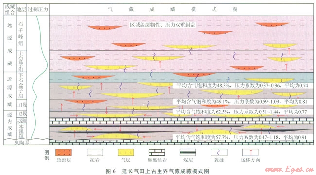 根據(jù)該區(qū)輸導(dǎo)體系、天然氣運(yùn)移聚集特征、成藏組合等建立了延長氣田上古生界氣藏成藏模式(圖6)。該區(qū)有2套區(qū)域性蓋層,第l套為下部太原組海相石灰?guī)r,另l套為上石盒子組 石千峰組泥巖及致密性砂巖,具有物性和壓力雙重封蓋。該區(qū)上古生界普遍發(fā)育泥巖超壓,具有壓力封存箱特征,其中上石盒子組—石千峰組為壓力封存箱的箱頂,為下部天然氣的富集成藏提供了優(yōu)越的封閉保存條件,箱底為本溪組的致密鋁士巖。