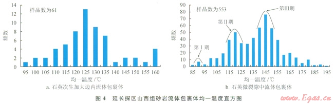 流體包裹體分析是研究油氣運(yùn)移充注期次的有效手段。選取山西組22個(gè)砂巖樣品進(jìn)行流體包裹體分析,根據(jù)鏡下觀察結(jié)果,流體包裹體主要分布在石英次生加大邊及石英顆粒微裂隙,其中砂巖石英次生加大邊內(nèi)流體包裹體均一溫度(圖4-a)分布在94.2~159.3℃,主峰溫度區(qū)間位于115~135℃;砂巖石英微裂隙中流體包裹體均一溫度(圖4-b)分布在82.7~193.8℃,并分為3個(gè)溫度區(qū)間,分別是80~95℃、95~130℃、l30~195℃,主峰溫度區(qū)間位于85~90℃、ll0~125℃和l35~155℃。石英加大邊內(nèi)流體包裹體的均一溫度主峰區(qū)間與石英裂縫中的第Ⅱ期流體包裹體均一溫度的主峰溫度區(qū)間相近,應(yīng)該屬于同一期酸性流體活動(dòng)。