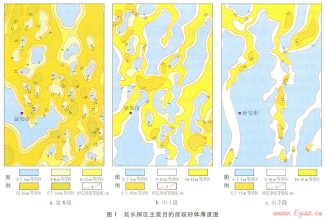 延長探區(qū)主力氣層為本溪組、山23層和山1段、下二疊統(tǒng)石盒子組8段。其中本溪組為潮坪—障壁島海岸沉積[10],儲(chǔ)集體類型主要為障壁島砂壩和砂坪,單個(gè)砂體規(guī)模較小,厚度介于2~10m,橫向連續(xù)性較差,平面分布零散,但主要分布于探區(qū)東南部;山西組和盒8段為湖泊—三角洲沉積體系,主要儲(chǔ)集體類型為三角洲前緣水下分流河道砂體,河口壩不發(fā)育,受盆地北緣物源影響,砂體呈南北向展布,東西呈透鏡體狀,厚度介于4~20m,其中盒8段砂體最為發(fā)育,分布范圍廣,厚度大(圖1)。各層位砂體垂向疊置,橫向連片,形成大面積復(fù)合砂體帶,是該區(qū)儲(chǔ)層砂體空間展布的基本特征。