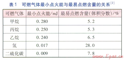 最小點(diǎn)火能指能夠引起可燃?xì)怏w與空氣混合物燃燒或爆炸的最小火花能量,單位為mJ,通常用來衡量可燃?xì)怏w混合物的點(diǎn)火敏感度。最小點(diǎn)火能不僅與可燃?xì)怏w的種類有關(guān),而且與可燃?xì)怏w的含量、點(diǎn)燃源的種類有關(guān)。當(dāng)可燃?xì)怏w達(dá)到最易點(diǎn)燃含量時,其點(diǎn)燃能量最小??扇?xì)怏w最小點(diǎn)火能與最易點(diǎn)燃含量的關(guān)系見表1。表l中的最小點(diǎn)火能是用電火花裝置測量得到的。