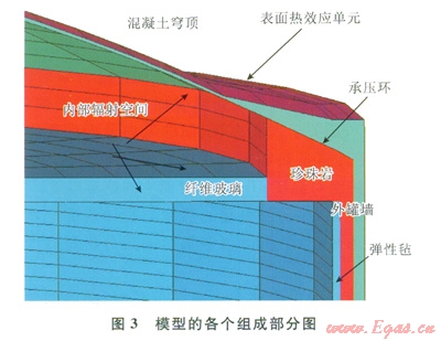 儲罐瞬態(tài)熱力分析模型包含穹頂和混凝土外罐墻。局部還有結(jié)構(gòu)的鋼內(nèi)襯板、玻璃纖維彈性氈、珍珠巖保溫材料和鋼筋混凝土承壓環(huán)。其穹頂厚度約為400mm。