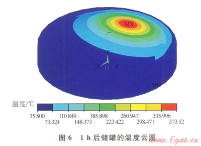 安全閥的熱輻射條件是根據(jù)相關國外規(guī)范[14],熱輻射能量為32kW/m2,安全閥高度離穹頂約l6m,持火燃燒6h?;馂臒彷椛涫撬矐B(tài)熱分析,即熱輻射隨著時間發(fā)生的。為了建立有限元模型的初始條件,在火災將要發(fā)生的ls時,執(zhí)行穩(wěn)態(tài)熱分析,得到儲罐的溫度分布情況。然后從1s~6h考慮安全閥火災的瞬態(tài)熱輻射,給安全閥孤立節(jié)點施加熱輻射能量,使儲罐獲得相應的背景輻射溫度。模型還要考慮通風情況下的強制對流,施加根據(jù)努賽爾系數(shù)計算得出的對流換熱系數(shù),并考慮外部環(huán)境溫度的約束條件。