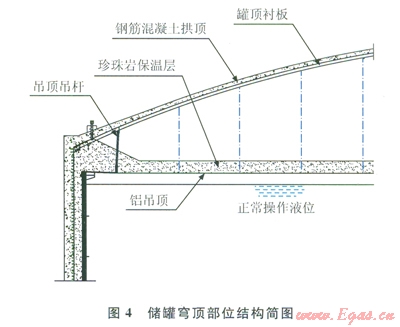 從圖4中可以看出,穹頂結(jié)構(gòu)上部僅由外部鋼筋混凝土拱頂和厚度為6mm的罐頂襯板組成,其下懸掛吊桿和鋁吊頂,鋁吊頂上填充珍珠巖或玻璃棉保溫層,鋁吊頂距離正常操作液位約500mm。如上所述,如果外罐頂出現(xiàn)爆坑,沖擊波進入罐內(nèi),雖然其沖擊荷載已急速衰減,但沖擊波會對鋁吊頂上部的保溫層造成破壞,引起火災(zāi)、爆炸等次生災(zāi)害。