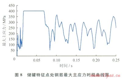 儲罐部分特征點B處鋼筋最大主應(yīng)力時程曲線如圖8所示,由于爆心處A點的鋼筋瞬間即達到設(shè)定的應(yīng)變極限不具代表性,故此處并未示出。圖8顯示B點的鋼筋一直處于較高的應(yīng)力水平,最大應(yīng)力已達到400MPa,但是未達到設(shè)置的應(yīng)變極限0.05,故尚未破壞,初始爆炸沖量并未使其到達應(yīng)力極值,后續(xù)的空氣沖擊波持續(xù)作用使其應(yīng)力逐漸增加。外罐鋼筋除爆心處發(fā)生破壞外,其余部分即使有瞬間到達應(yīng)力限值,但未達到設(shè)定的應(yīng)變極限,總體來說,外罐鋼筋應(yīng)力響應(yīng)較安全。