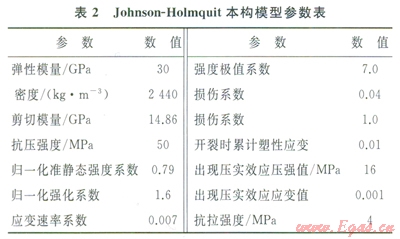 混凝土采用Johnson-Holmquit本構(gòu)模型,模型參數(shù)見表2。該模型因綜合考慮了損傷、應(yīng)變率、靜水壓以及壓碎、壓實效應(yīng),適合大應(yīng)變、高應(yīng)變率和高靜水壓情況,被廣泛地應(yīng)用于混凝土撞擊、侵徹和爆炸等強動載問題的數(shù)值模擬。鋼筋材料模型采用雙線性隨動硬化模型,用兩個斜率(彈性和塑性)來表示鋼筋的應(yīng)力應(yīng)變特性,具體參數(shù)見表3。