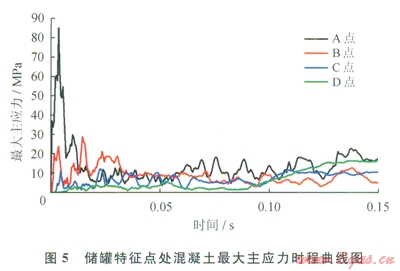 C點在4.5ms時也出現(xiàn)了一個l0.7MPa的脈沖峰值,原因同上;在24.8ms出現(xiàn)一個ll.9MPa的峰值響應(yīng),是由于空氣沖擊波波陣面?zhèn)鞑サ?span lang="EN-US">C點所致,其后應(yīng)力急劇下降并伴有高頻鋸齒振蕩[16]。從圖5中可以看出D點在80ms以前應(yīng)力持續(xù)小幅振蕩,80ms以后為大幅低頻響應(yīng),如3.1節(jié)中所述,這一現(xiàn)象與其特殊的位置和構(gòu)造有關(guān),爆炸沖擊波在此處連續(xù)作用于罐體,導(dǎo)致罐體疲勞損傷??傮w來說,A、B點雖未發(fā)生破壞,但均已處于較高的應(yīng)力水平,C點至F點混凝土的應(yīng)力響應(yīng)均在安全范圍之內(nèi),這也印證了前述900kg當(dāng)量為罐體抗爆極限值的結(jié)論。