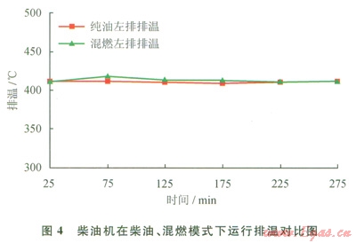 柴油機(jī)組在混合燃料狀態(tài)運(yùn)行時(shí),機(jī)組運(yùn)行的各項(xiàng)參數(shù)與柴油機(jī)標(biāo)定參數(shù)相近,在啟動(dòng)、關(guān)閉等過程,發(fā)動(dòng)機(jī)運(yùn)行平穩(wěn),無異常。當(dāng)負(fù)荷過低時(shí),機(jī)組混燃模式下的排溫略高于純柴油模式,但仍在安全范圍以內(nèi),不對柴油機(jī)組的運(yùn)行造成影響。
