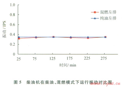 2)排溫和振動(dòng)試驗(yàn)分析。試驗(yàn)功率為450kw,柴油機(jī)在柴油、混燃模式下運(yùn)行300min(替代率33.81%),排溫和振動(dòng)[8-10]試驗(yàn)結(jié)果相差不大(圖4、5)。
