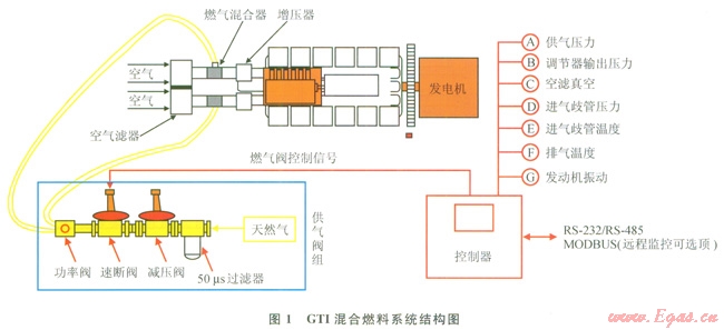 GTI混合燃料技術(shù)是利用美國Altronic公司生產(chǎn)的GTI混合燃料系統(tǒng)對柴油機(jī)進(jìn)行改造的技術(shù)[1]。經(jīng)GTI混合燃料技術(shù)改造的混合燃料發(fā)電機(jī)組,能夠同時(shí)燃燒柴油和天然氣。被改造的機(jī)組在啟動(dòng)和怠速時(shí)按純柴油工作方式運(yùn)行,達(dá)到混燃條件后進(jìn)入混合燃料運(yùn)行模式。GTI混合燃料控制系統(tǒng)允許原柴油機(jī)監(jiān)控系統(tǒng)控制柴油機(jī)的轉(zhuǎn)速,在恒定的負(fù)載下,由于額外吸入了天然氣,柴油機(jī)燃料超出需要,柴油機(jī)的轉(zhuǎn)速輕微增加,為了保持熱值平衡和設(shè)定的轉(zhuǎn)速,監(jiān)控器會(huì)迅速調(diào)節(jié)減少噴油量,從而實(shí)現(xiàn)天然氣對柴油的替代。反之,當(dāng)已達(dá)平衡狀態(tài)后天然氣供給減少時(shí),柴油機(jī)監(jiān)控器會(huì)迅速實(shí)時(shí)動(dòng)態(tài)地調(diào)節(jié)噴油量,建立新的燃油供給平衡,保持設(shè)定轉(zhuǎn)速,維持柴油機(jī)正常運(yùn)行。