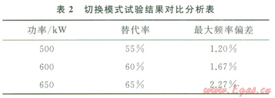 4)切換模式對比分析。分別在500kW、600kW和650kW 3種工況下,進(jìn)行天然氣切斷時(shí)的響應(yīng)測試,最大頻率偏差2.27%,小于國家標(biāo)準(zhǔn)5%。分別在500kW(替代率55%)、600kW(替代率60%)和650kW(替代率65%)工況下,GTI機(jī)組頻率增加均沒有超過l%。試驗(yàn)結(jié)果表2所示。