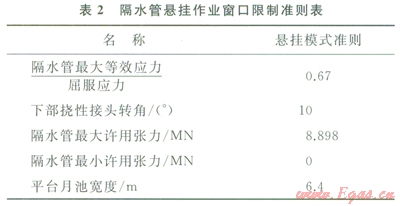 在計(jì)算隔水管懸掛作業(yè)窗口時(shí),同樣也需要首先明確隔水管懸掛作業(yè)窗口的限制準(zhǔn)則,參考相關(guān)研究成果[6,11],確定的隔水管懸掛作業(yè)窗口限制準(zhǔn)則見表2。