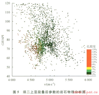 安岳地區(qū)須二上亞段主要為高孔砂巖、致密砂巖和泥巖,從疊后參數(shù)的巖石物理分析結(jié)果看,伽馬、速度、孔隙度各類樣點值分散、疊置,常規(guī)屬性難以區(qū)分出高孔砂巖(圖5)。
