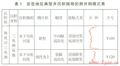 本次研究采用6級劃分方案(巨旋回、超長期旋回、長期旋回、中期旋回、短期旋回、超短期旋回),筆者以Yl05井為例,將須二段劃分為一個中期旋回,即一個上升半旋回,代表基準面上升,可容納空間增加,對應三角洲前緣亞相。該區(qū)典型井沉積微相的測井相模式如表1所示。這一時期總體上為一個水域變寬、沉積物粒度逐漸變細的時期,層序疊加樣式為退積式;在其內(nèi)部進而劃分出兩個短期旋回,分別對應須二下亞段和須二上亞段,其中須二上亞段GR曲線呈箱狀(2233~2316m),說明有大套砂體疊置,層序疊加樣式為加積式到退積式,識別為可容納空間增加的上升半旋回(圖2)。