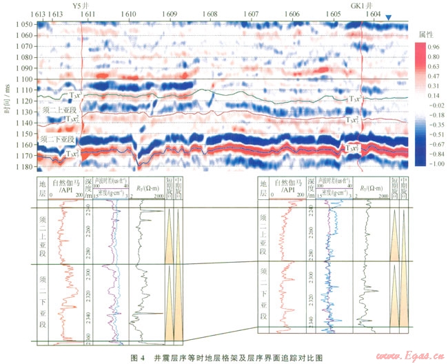 由于河湖相地層橫向變化大,而層序界面的追蹤對比必須是等時的、精細的,因此,在單井層序劃分的基礎上,以區(qū)內(nèi)8口典型井合成地震記錄為橋梁,以波形、波組特征以及能量的相關(guān)性為識別依據(jù),在高分辨率處理的地震資料上進行層序界面的對比追蹤,最終建立該區(qū)須二段等時地層格架,確保了后續(xù)地震屬性的準確提取。圖4是以Y5、GKl井為例的連井解釋剖面。