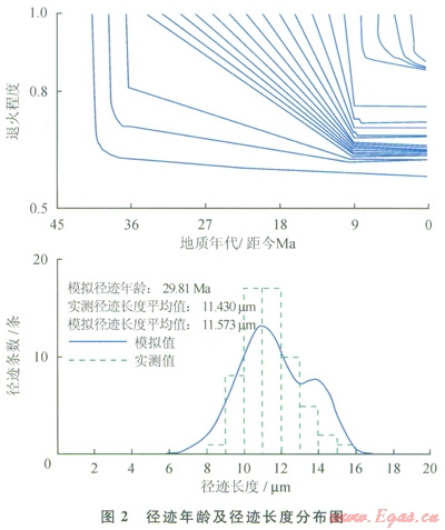 磷灰石裂變徑跡法的熱史模擬步驟為:①根據(jù)已有熱參數(shù)資料,給出熱史約束條件;②設定大量的溫度時間曲線,通過正演求出徑跡長度、徑跡年齡模擬值;③將正演結果與實測徑跡長度、年齡進行比較,獲得最佳模型,即得到熱史模擬結果。