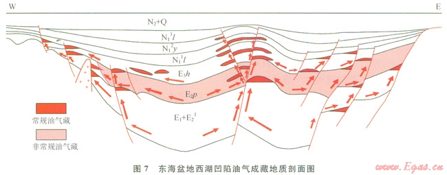 東海盆地位于東海陸架區(qū),基底是燕山期陸緣花崗巖帶,新生代歷經(jīng)裂陷期、坳陷期及新構(gòu)造期3大構(gòu)造階段。其中裂陷期為古新世—始新世,坳陷期為漸新世—中新世,上新世—第四紀(jì)為新構(gòu)造期。東海盆地以新生代沉積地層為主,從古新統(tǒng)至第四系均有發(fā)育。該盆地經(jīng)歷了5次主要構(gòu)造改造作用,特別顯著的是發(fā)生過多期正反轉(zhuǎn)(圖6、7)。東海貧地呈二坳二隆構(gòu)造格局。西部坳陷帶(長江坳陷、臺北坳陷)、中央隆起帶(虎皮礁隆起、海礁隆起、漁山東隆起)、東部坳陷帶(福江凹陷、西湖凹陷、釣北凹陷)和東部隆起帶(釣魚島隆褶帶,即陸架外緣隆起)。東海盆地形成于太平洋板塊俯沖導(dǎo)致的弧后擴張作用;隨著俯沖帶的不斷東撤,盆地內(nèi)部呈由西向東逐漸變新的構(gòu)造遷移特征,沉積—沉降中心逐漸東移,形成了凹陷之間構(gòu)造—沉積演化的差異。古新世裂陷主要發(fā)生在東海盆地的西部坳陷帶,始新世—漸新世裂陷主要發(fā)生在其東部坳陷帶。