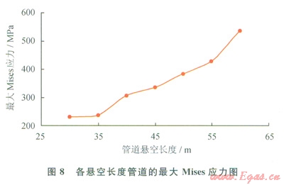 2)保持其他工況參數(shù)不變,改變懸空長度分別為35m、40m、45m、50m、55m、60m時(shí),汁算管道最大應(yīng)力、彎矩和撓度(見圖8~10和表l)。可見:截面A處撓度最大,截面B處剪力最大,管道易在截面B處發(fā)生剪力破壞。當(dāng)懸空長度為55m時(shí),管道已接近失效上限,仍處于安全范圍。60m時(shí),管道最大應(yīng)力大于485MPa,此時(shí)管道失穩(wěn),超出安全極限,理論上已失效。