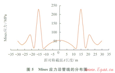 1)圖5、6表示了現(xiàn)場實(shí)際懸空長度為30m時(shí),應(yīng)力和撓度沿管線的分布情況,可見Mises應(yīng)力和豎直方向應(yīng)力在±15m處最大,而最大撓度出現(xiàn)在模型C-C處,也就是懸空水平對稱處。