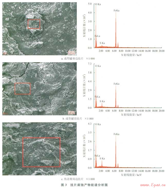 2)通過掃描電鏡觀察,發(fā)現(xiàn)腐蝕掛片表面形成片狀腐蝕產(chǎn)物;能譜顯示腐蝕產(chǎn)物主要含Fe、O元素和少量S元素。分析其腐蝕機(jī)理,腐蝕產(chǎn)物主要呵能是FeOOH、FeSO4、Fe2O3和Fe3O4。