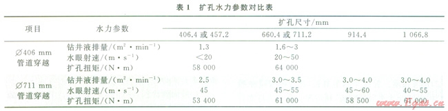 Æ406mm管道穿越擴(kuò)孔施工時(shí)發(fā)現(xiàn)鉆井液排量低于2m2/min、水眼射速低于50m/s時(shí)擴(kuò)孔扭矩大,鉆具磨損快。Æ711mm管道穿越擴(kuò)孔施工時(shí)調(diào)整了施工參數(shù),改進(jìn)了擴(kuò)孔器選型,使得擴(kuò)孔扭矩得到了有效控制,鉆屑及時(shí)排除,水力切削充分,鉆具幾乎沒有磨損,加快了施工進(jìn)度,保證了每次擴(kuò)孔一次性成功。根據(jù)3次管道穿越對(duì)鉆進(jìn)參數(shù)的調(diào)整情況,并結(jié)合現(xiàn)場(chǎng)實(shí)際可以達(dá)到的施工條件,最優(yōu)的鉆進(jìn)參數(shù)統(tǒng)計(jì)結(jié)果見表2。