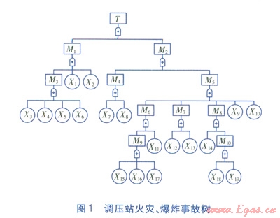 事故樹分析法作為一種工程系統(tǒng)可靠性分析與評價的有效方法,可快速、全面、形象、簡明地分析各種影響因素的相互關(guān)系,為分析調(diào)壓站火災(zāi)、爆炸事故原因提供了有效手段[2-6]。本文對事故樹分析法在調(diào)壓站事故原因分析的應(yīng)用進行探討。