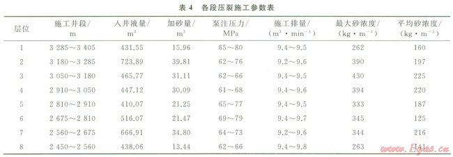 該井8段壓裂施工共注入地層液體總量3949.44m3,加入陶粒207.93m3,最高施工壓力80MPa,最高砂濃度394kg/m3,最大施工排量9.8m3/min。各段壓裂施工參數(shù)如表4所示。