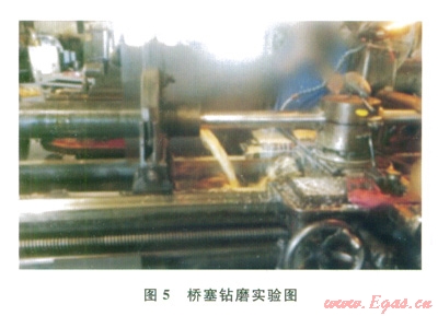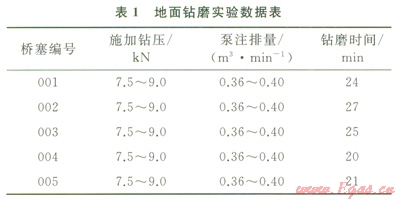 將坐封有新型速鉆復(fù)合橋塞的試驗(yàn)套管固定于專用鉆磨試驗(yàn)架上,如圖5所示,用Æ73mm螺桿馬達(dá)帶專用磨鞋,水泥車泵注清水驅(qū)動(dòng)螺桿馬達(dá),進(jìn)行了5套橋塞鉆磨實(shí)驗(yàn),其實(shí)驗(yàn)數(shù)據(jù)如表1所示。