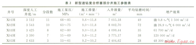 自主研制生產(chǎn)的新型速鉆復(fù)合橋塞已成功應(yīng)用已20余井次,橋塞動(dòng)作靈活,密封可靠,鉆磨效率高,表2為其中5口井的施工參數(shù),下面針對(duì)某一實(shí)例井的應(yīng)用情況進(jìn)行分析。