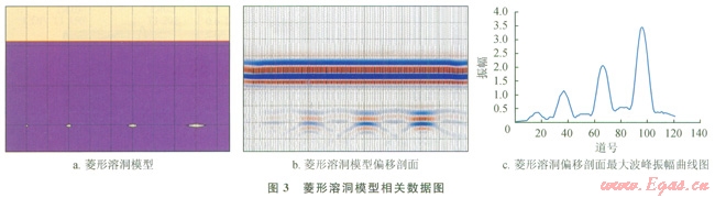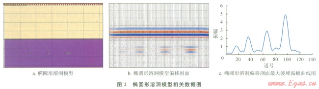 圖2-b是橢圓形溶洞偏移剖面,圖2-c為橢圓形溶洞最大波峰振幅曲線圖;圖3-b、圖3-c分別是菱形溶洞偏移剖面及最大波峰振幅曲線圖??梢钥吹?,無論是橢圓形模型還是菱形模型,隨著溶洞橫向尺度的增加最大波峰振幅是增加的,這和長方形溶洞正演模擬結(jié)果很相似。
