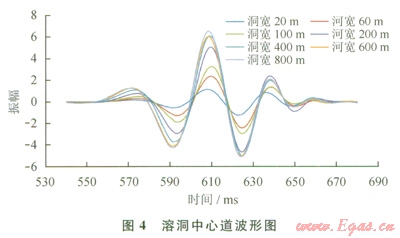 以長方形溶洞模型為例,提取偏移數(shù)據(jù)溶洞響應中心道,其波形圖如圖4所示。由圖4可見:各個地震道除振幅強弱不同外,其波形特征大致相同,為兩強谷夾一強峰且峰強于谷的特征;各道波形時長大致相同,這說明溶洞地震響應時長與溶洞寬度沒有必然聯(lián)系;振幅雖然隨著溶洞橫向尺度的增大而增大,但是增大的幅度是在不斷減小的,尤其當溶洞寬度大于200m后,溶洞對應的最大波峰振幅的增加近乎停止。