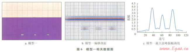 圖6、7分別是模型一和模型二的相關(guān)數(shù)據(jù),由圖6-c可知,模型一中溶洞對應振幅的關(guān)系為:長方形溶洞>不規(guī)則溶洞>半圓形溶洞,這與溶洞面積關(guān)系是一致的,且模型一中第l個溶洞和第3個溶洞形態(tài)大小差距很小,但在最大波峰振幅曲線上依然可以將兩者區(qū)分開,由圖7-c可知模型二也有相似的結(jié)論,故而在菲涅爾帶內(nèi)溶洞形態(tài)對于振幅是敏感的。
