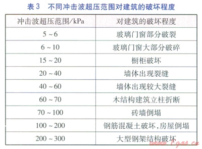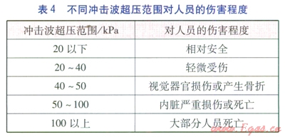 不同沖擊波超壓范圍對(duì)建筑物的破壞程度、對(duì)人體傷害程度分別見表3、4[5]。