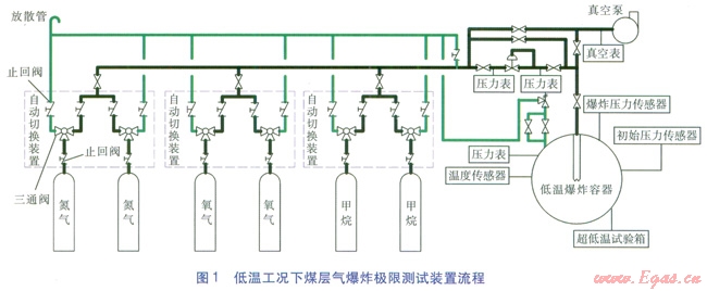 根據(jù)測試裝置流程圖,其裝置主要由低溫爆炸容器、配氣系統(tǒng)、溫控系統(tǒng)、點火系統(tǒng)、檢測系統(tǒng)等幾部分構成。