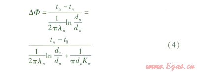 對于水平安裝供熱管道,設(shè)定絕熱層熱導(dǎo)率與方向無關(guān)且等于測點n方向的熱導(dǎo)率ln,根據(jù)式(3)與能量守恒定律,以測點所在圓為分界線,測點內(nèi)圓絕熱層與測點外圓絕熱層的熱流量相等。供熱管道單位長度熱損失DF可寫為: