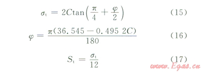 地層強(qiáng)度參數(shù)中對井壁穩(wěn)定性產(chǎn)生直接影響的是黏聚力和內(nèi)摩擦角,筆者認(rèn)為,黏聚力和內(nèi)摩擦角是巖石相互關(guān)聯(lián)的兩個(gè)強(qiáng)度參數(shù),地層強(qiáng)度的改變會導(dǎo)致二者同時(shí)發(fā)生變化,不應(yīng)將二者的影響單獨(dú)分析,而應(yīng)直接以單軸強(qiáng)度作為變化量進(jìn)行研究。假設(shè)地層強(qiáng)度參數(shù)服從關(guān)系式(15)[23],且黏聚力和內(nèi)摩擦角滿足經(jīng)驗(yàn)關(guān)系式(16)[24],則可用地層單軸抗壓強(qiáng)度同時(shí)表征黏聚力和內(nèi)摩擦角的變化。分析時(shí)還應(yīng)當(dāng)考慮地層強(qiáng)度變化對拉伸強(qiáng)度的影響,地層抗拉強(qiáng)度(St)與單軸抗壓強(qiáng)度(st)的關(guān)系由三維Griffith準(zhǔn)則[23]給出,滿足式(17)。