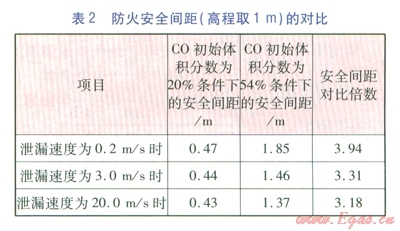 FLUENT軟件雖具有很高的權(quán)威性,但該空間模型還較簡單。危害氣體源僅考慮CO,忽略其他氣體(如H2)的影響??赏ㄟ^理論擴(kuò)散計算對微量泄漏工況進(jìn)行驗(yàn)證(無初速度和重力影響)。理論擴(kuò)散計算得知,對微量泄漏,2m高程處,C0體積分?jǐn)?shù)達(dá)到0.02%時7C0初始體積分?jǐn)?shù)為54%的安全間距是初始體積分?jǐn)?shù)為20%的安全間距的1.64倍,該值與其2m高程時的模擬安全間距對比倍數(shù)l.65極為接近,故可充分表明軟件模擬的置信性。
