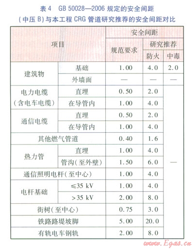 GB 50028--2006規(guī)定的安全間距(中壓B)與本工程CRG管道研究推薦的安全間距對比見表4。