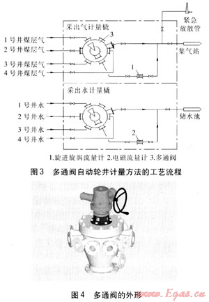 優(yōu)點:采用手動三通閥切換,大大減少了流量計的配置數(shù)量,造價降低。缺點:需要人工定期切換手動三通閥,以保證每口單井連續(xù)計量4~8h。如遇雨雪天氣不能人工進(jìn)行切換時,會使其他單井排采數(shù)據(jù)的準(zhǔn)確性受到影響。單井?dāng)?shù)量多于4口時,需要增加流量計的數(shù)量。造價:采出氣計量橇約6.2×104元,采出水計量橇約4.6×104元。
