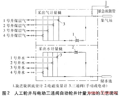 煤層氣井采用油管排水、套管采氣的井場工藝。由抽油機(jī)將地層水采出,經(jīng)電磁流量計計量后排至井場儲水池中;煤層氣從煤層解析后由套管采出,在井場通過旋進(jìn)旋渦流量計計量后,經(jīng)采氣管道輸送至集氣站。煤層氣和地層水采出后,均需周期性連續(xù)計量。每口煤層氣井每次連續(xù)計量時間一般為4~8h,氣水產(chǎn)量波動較大或產(chǎn)量較低的煤層氣井,可延長計量時間至8~24h。