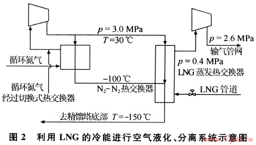 常用的空氣分離法是將空氣液化,通過氟利昂冷凍機(jī)、透平膨脹機(jī)進(jìn)行空氣的液化和分離,制成液態(tài)的氮?dú)?、氧氣、氬氣等。而LNG冷熱能用于空氣分離則是通過循環(huán)氮?dú)獾睦鋮s來實(shí)現(xiàn)(見圖2)。一般來說,生產(chǎn)10×104m3的液態(tài)氣體大約需要650×104kJ的冷卻能。利用LNG的冷熱能,循環(huán)氮?dú)鈮嚎s機(jī)可小型化;因不需要冷凍機(jī),建設(shè)費(fèi)用也可相應(yīng)減少;此外,LNG作為空氣分離裝置的預(yù)冷劑,生產(chǎn)液氬的空分裝置中,利用其冷能冷卻和液化由下塔抽出經(jīng)過復(fù)熱的循環(huán)氮,可以省去氟利昂制冷機(jī)以及氮透平膨脹機(jī)組,使產(chǎn)品能耗平均降低0.5kwh/m3,裝置的投資費(fèi)用可減少10%左右,生產(chǎn)成本降低20%~30%。