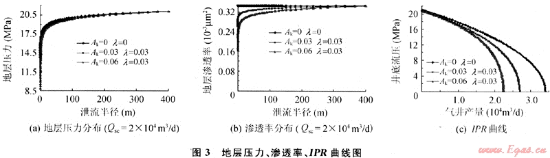 如圖3-a所示,在氣體采出過程中,地層中存在壓降漏斗;氣井以2×104m3/d生產(chǎn)時(shí),應(yīng)力敏感常數(shù)Ak和啟動(dòng)壓力梯度λ越大,地層中壓力下降越多;且要達(dá)到相同的產(chǎn)量,應(yīng)力敏感和啟動(dòng)壓力梯度影響的氣井,要以更低的井底流壓,更大的生產(chǎn)壓差生產(chǎn)。