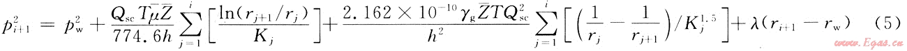 將i=3,4,…,n分別帶入式(5)中,可以得到n-2個(gè)類似的方程,并將這n-2個(gè)方程和式(3)和式(4)一起疊加,便可以得到考慮儲(chǔ)層變形和啟動(dòng)壓力梯度、非達(dá)西流動(dòng)的氣井產(chǎn)能方程: