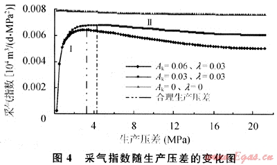 與低滲透變形介質(zhì)油藏合理生產(chǎn)壓差的定義相同,Qsc/(pe2-p22)(氣井采氣指數(shù))最大值對(duì)應(yīng)的壓差即為合理生產(chǎn)壓差(圖4),當(dāng)Ak=0.06、λ=0.03時(shí),合理生產(chǎn)壓差為3.21MPa;當(dāng)Ak=0.03、λ=0.03時(shí),合理生產(chǎn)壓差為4.28MPa,應(yīng)力敏感常數(shù)越大,氣井的合理生產(chǎn)壓差越小。