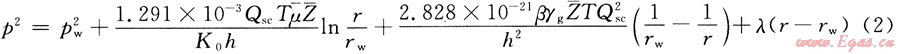 氣井的產(chǎn)量為Qsc,氣體的黏度為μ,氣體的偏差系數(shù)為Z,啟動(dòng)壓力梯度為λ,結(jié)合氣井的穩(wěn)態(tài)產(chǎn)能方程[3],同時(shí)考慮啟動(dòng)壓力梯度,有