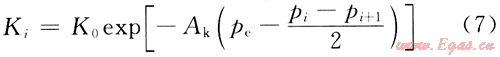 通過巖心應(yīng)力敏感實(shí)驗(yàn),發(fā)現(xiàn)巖石滲透率與有效應(yīng)力滿足指數(shù)關(guān)系,每一個(gè)網(wǎng)格節(jié)點(diǎn)i的滲透率可表征為有效應(yīng)力的函數(shù)[4]: